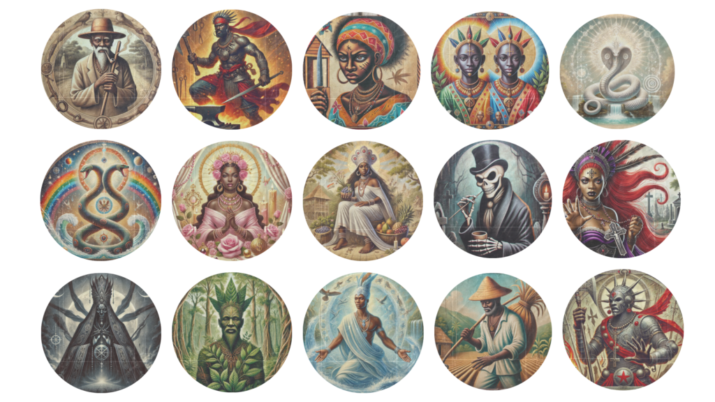 Lwa Gede yo, bò kote pa yo, gen rapò ak lanmò ak zansèt, pandan lwa Nago yo, ki soti nan tradisyon Nigeria, mete aksan sou kouraj ak disiplin.